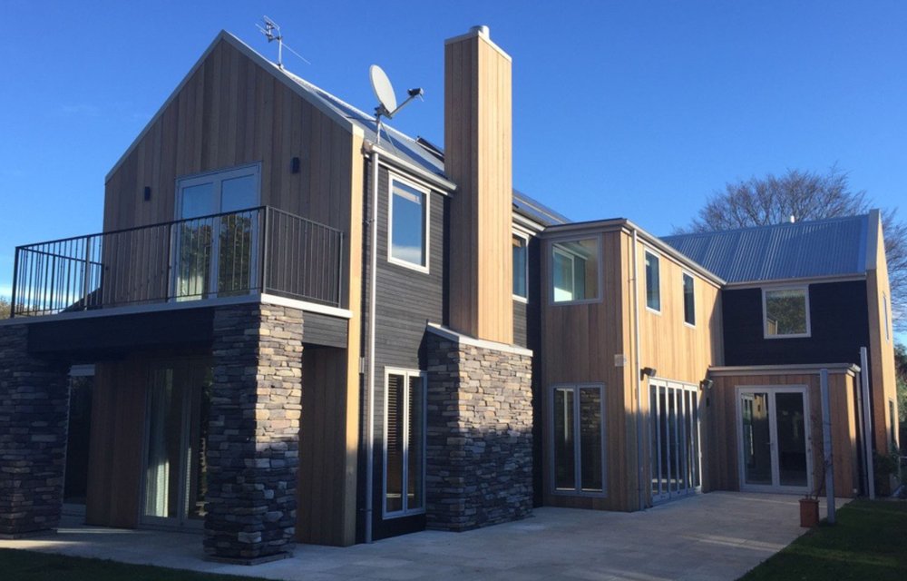Although in very good condition, real estate buyers were nervous to purchase a property clad with the contentious polystyrene panels linked to ‘leaky building syndrome’, so the current owners opted to reclad the exterior to prepare for sale. Different architectural elements were emphasised with the use of either natural vertical cedar or horizontal black cedar, and complemented with the use of natural schist stone on chimneys, balcony columns and the main entrance.