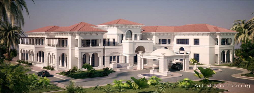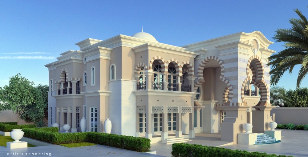 The exterior architecture is Moroccan/Andalusian in style with highly decorative classical interior detailing being inspired by the Palace of Versailles.