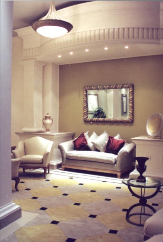 A expansive new corridor was constructed to connect the existing hotel to the new royal tower. Shops line each side of the corridor forming an arcade also providing entrance to the Health Club and the Tea Lounge as shown here.